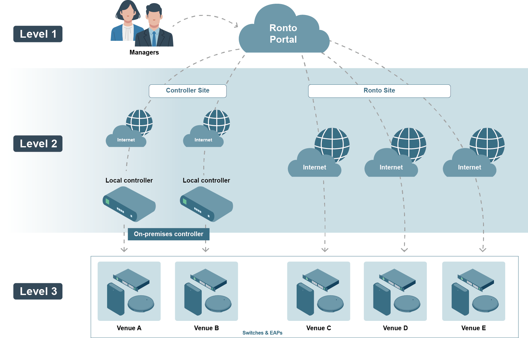 Ronto solution’s management architecture allows administrators to manage multiple different entities simultaneously, such as restaurants, bookstores, clinics, and supermarkets. It can also manage multiple branches under the same entity, such as restaurant branches located in different regions, a feature known as multi-tenant management. A managed entity can be a small one using on-premises controller as a gateway too, or a larger one which is managed directly by the cloud controller. The former is called a controller site and the latter is called a Ronto site. Once administrators login to the Ronto Portal, they can see and manage all the Ronto sites and Controller sites legitimately manageable.