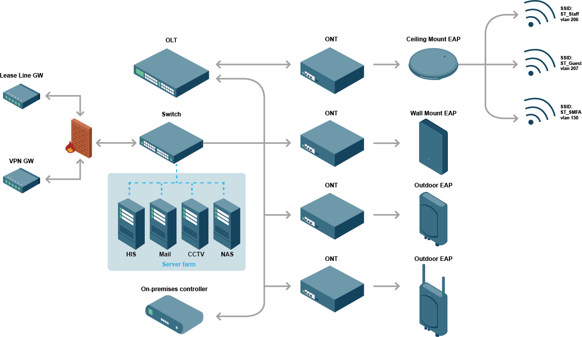 Combining with Passive Optical Network solution (Passive LAN) with our Ronto Enterprise solution, we can constitute a complete network infrastructure for Hospitality environment. The below is one of the cases for a mid-size hospital (500 patient beds) in a city area. The infrastructure consists of three parts, one is the security devices to provide firewall, VPN and Lease line gateways. The 2nd part is the Passive LAN using GPON technology to provide power-free connectivity from the hotel center to each Clinic room, ward, meeting room, and office. The Ronto solution will be the last mile of the infrastructure, using Ethernet switches and the Access points to cover all the areas of the hotel.