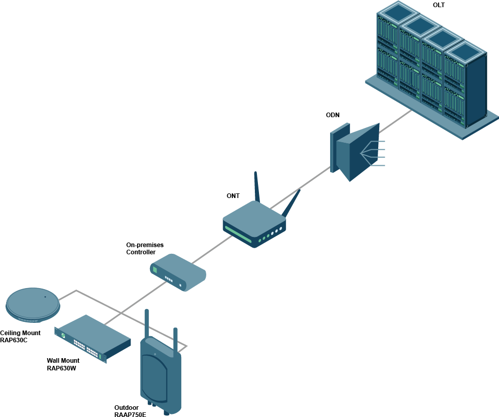 This is the solution for the enterprise BU of a telecom operator. The BU leverages the GPON broadband solution of the Telecom operator to provide broadband connection to small commercial customers, e.g., restaurant, dental clinic, ice cream shop and grocery. Usually the GPON ONT provides Layer 2 internet service to the business customers. The Ronto on-premises controller plus the POE powered EAPs can then provide internal communication service of the small business.